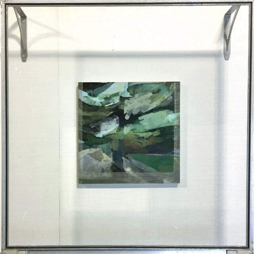 is a series of work that explores the ways a landscape is framed. Included in the oil and board paintings are the residential and commercial architecture that is usually cropped out of a photograph or intuitively eliminated. Our effort of readjusting what we want to see is further tested with a window screen that hovers in front of each painting, resembling a traditional mat and picture frame.